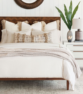 Our design assistant Onui has new bedding on her wish list for Santa. An updated style and fresh new colors in warmer, neutral tones and shades will provide a nice foundation with the option to add pops of color and change out with the seasons. The two collections below from Eastern Accents have caught her eye. Eastern Accents is one of our favorite vendors for bedding. It offers a wide range of collection styles and has various fabrics to consider. It also provides a custom program for drapery in the same fabrics as the bedding collections to make coordinating a bedroom easy. Each of the collections Onui has her eye on have great patterns and texture for visual interest, while using several shades of neutrals. It’s an interesting look for certain. They will also play nicely with the cow hide rug that Onui purchased for herself last year at Christmas!