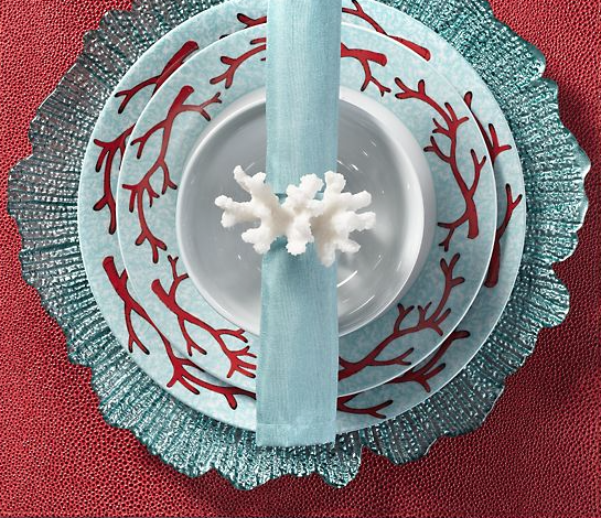 This coral dinnerware has a stunning branch coral pattern with a beautiful combination of coral red and aquamarine on glossy white porcelain.